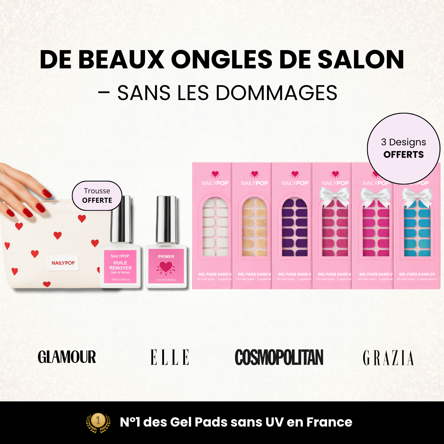 J’ai travaillé avec l’équipe NAILYPOP pour développer ces Gel Pads sans UV afin d’offrir un résultat digne d’un salon directement chez vous, sans l’exposition aux produits chimiques non polymérisés des gels traditionnels.